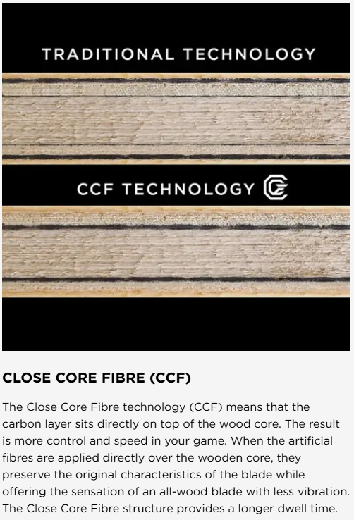 Cybershape is a 5+2-ply blade based on CCF (Close Core Fibre) technology, which means that the carbon layer sits directly on top of the wood core. The result is more control and speed in your game. By means of the lightweight and technologically advanced, German-made carbon fibre composite, we were able to offset its weight, so although Cyberspace has a larger surface area than a regular blade, it is not heavier. Cybershape’s unique shape also makes it easier for the player to see the hitting area when serving. Thanks to its different angles, the player has six corners to choose from, depending on the type and amount of spin they want.